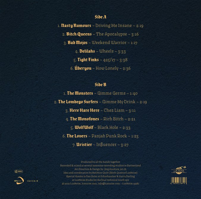 We’re on this punk & garage compilation along with the likes of Tight Finks, Bad Mojos, Delilahs, The Monsters, The Lombego Surfers, Bitch Queens, Uristier and many more. All in all 13 killer Swiss bands with 13 brand new, previously unreleased tracks. Recorded and produced last autumn & winter. Our middle fingers to the pandemic, so to speak.