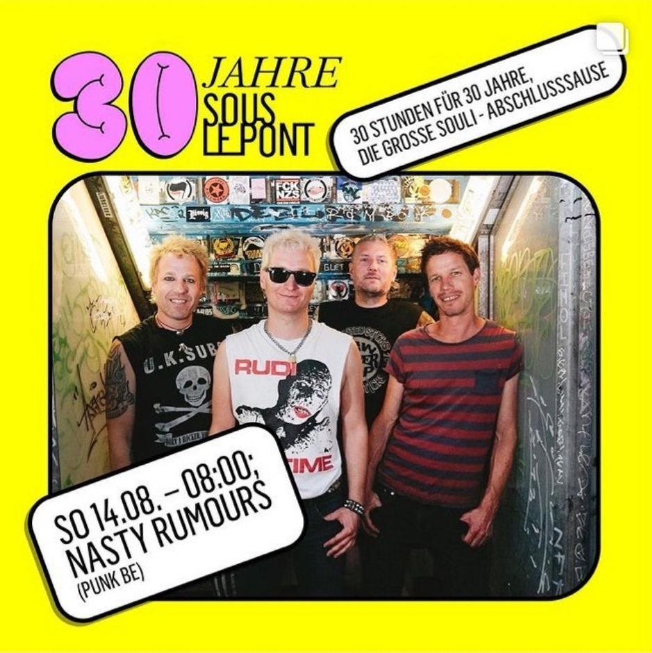 Celebrating 30 years of cooking and serving food at wonderful „Sous Le Pont„, Reitschule, Bern. One week of events coming to an end this sunday with us playing some sleepy mornin‘ tunes at around 8am.